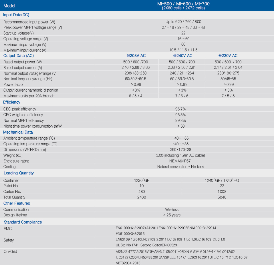 “The World’s First Daisy-Chain 2 in 1 Microinverter for large scale commercial application” is designed for dual solar panels with double MPPTs, and wide DC input operating voltage range (16-60V) and low start-up voltage (22V only).Hoymiles 2 in 1 microinverter MI-500/MI-600/MI-700 is the world’s most powerful microinverter solution for dual solar panels with CEC weighted efficiency as high as 96.5% (world’s No.1 for 2 in 1 unit in 2015); with quicker installation and much higher power density compared with single unit, it’s also one of the best-selling microinverters for Hoymiles up to now worldwide.