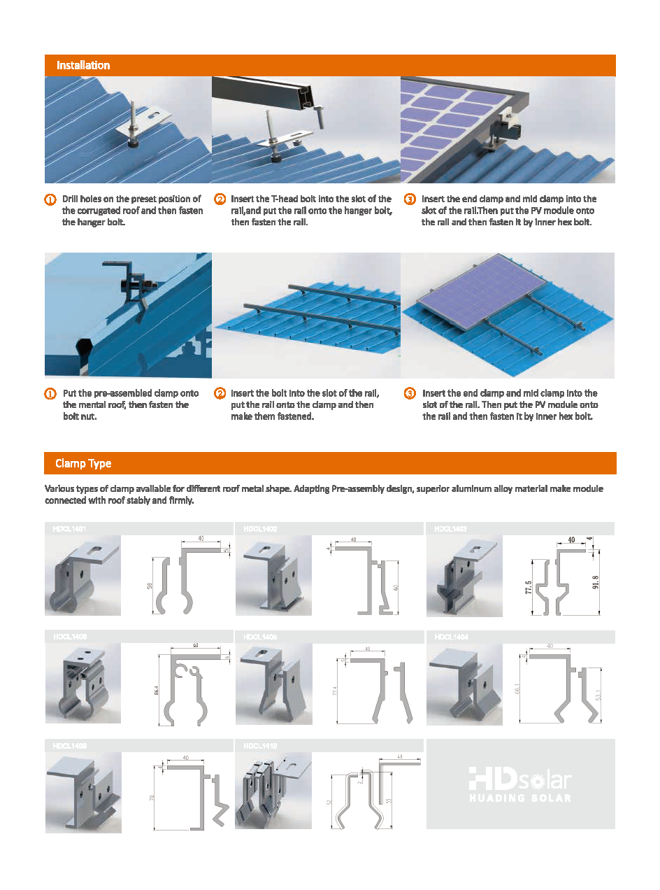 This system is widely used in flat roof and tilt roof and can be large-scale installed. With special aluminum rails, ‘z’ clamp and rail connection technology, there is no need in-situ processing which make the installation of panels faster and more convenient.