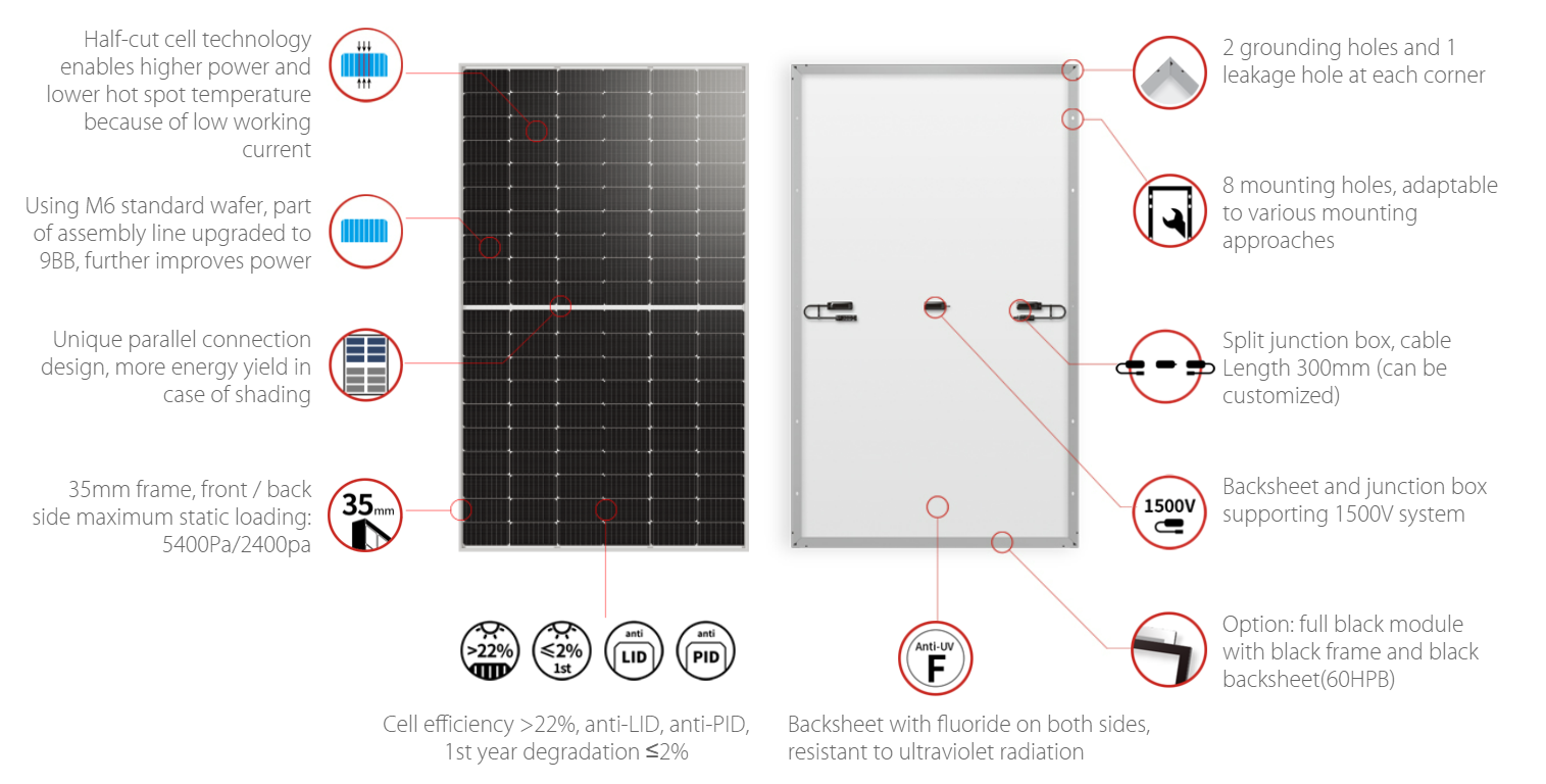 Perc Cell:The PERC cell has a passivated rear side and a laser grooving process, which significantly improves the cell efficiency.