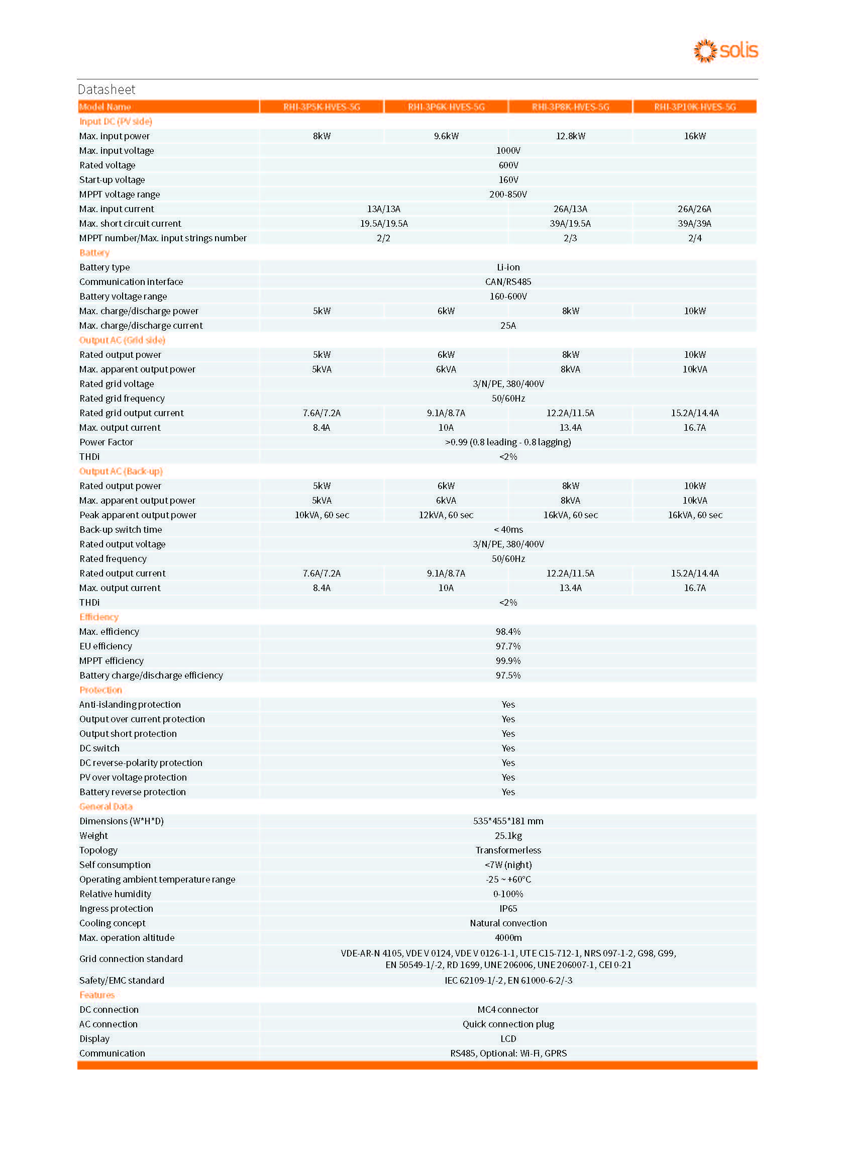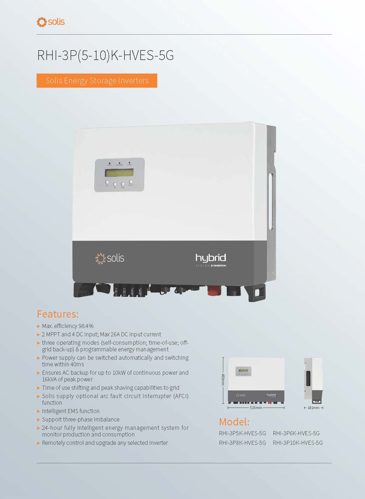 Hybrid Inverter | 5.0-10.0KW | Three Phase | 2 MPPT|. Solis series is grid-tied solar inverter specially designed for use with batteries energy storage in the home PV Power System