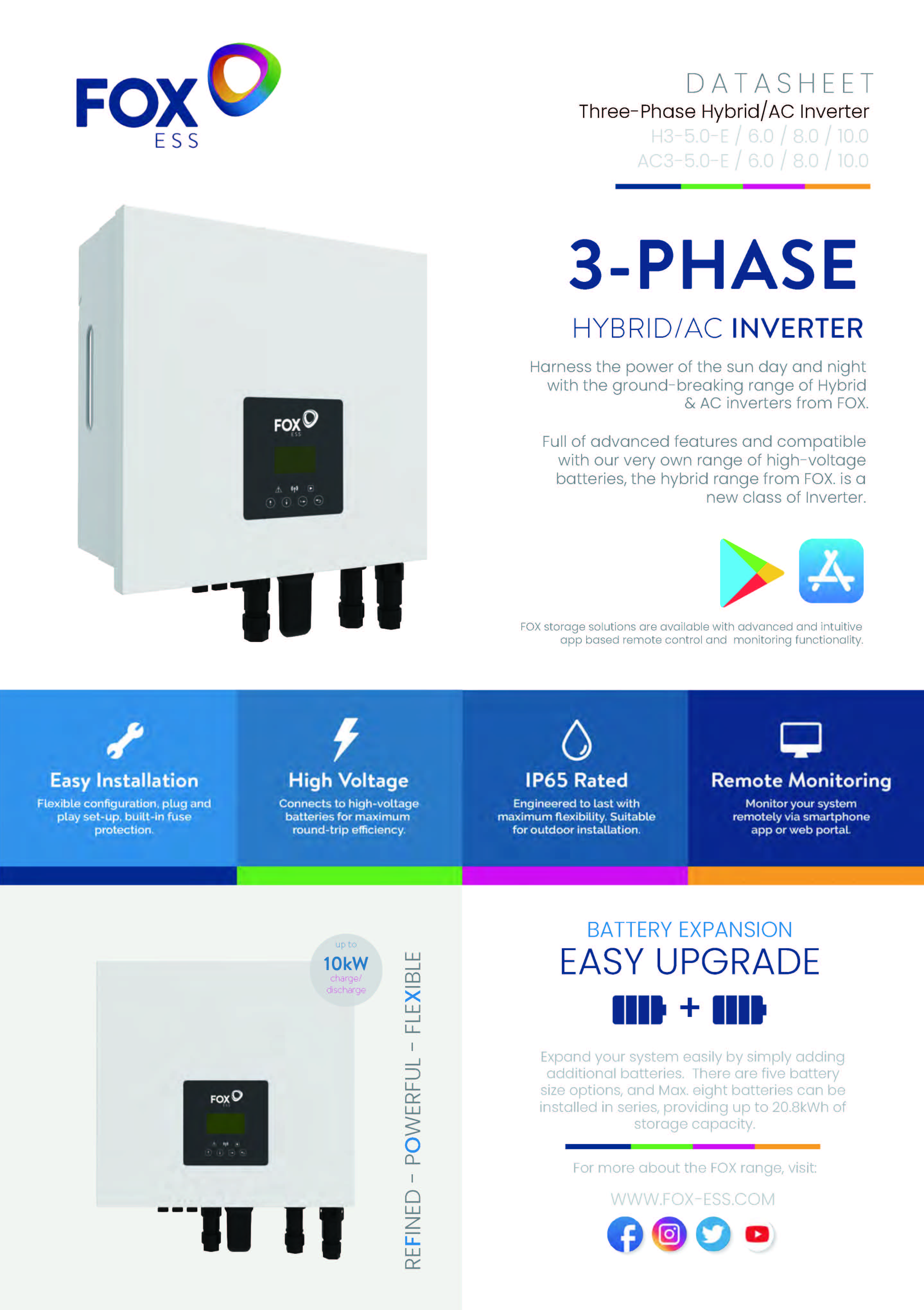 Hybrid Inverter | 5.0-10.0KW | Three Phase | 2 MPPT|. Fox Ess series is grid-tied solar inverter specially designed for use with batteries energy storage in the home PV Power System